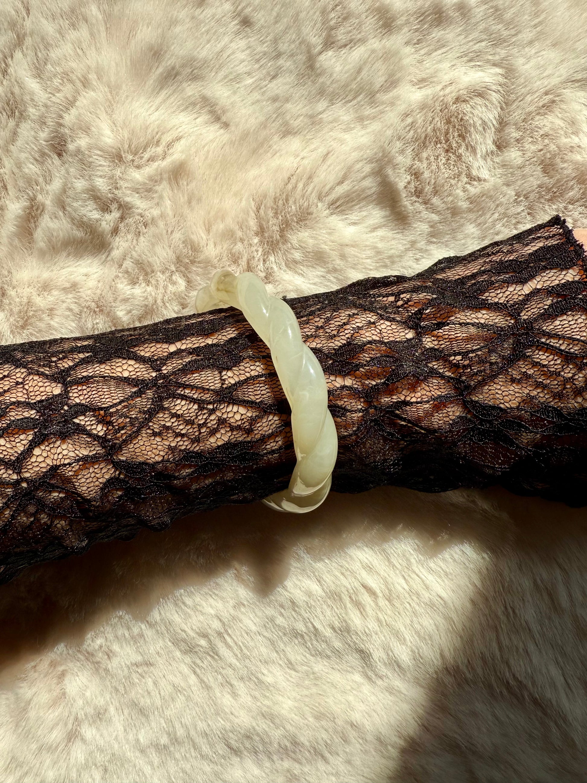 Bracelet type manchette fermé en résine couleur beige effet torsadé.