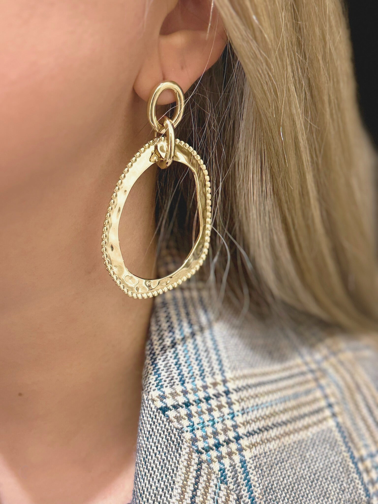 Boucles d'oreilles pendantes en acier inoxydable composées de 2 anneaux ovales et d'une pièce ajourée aux contours milgrain.