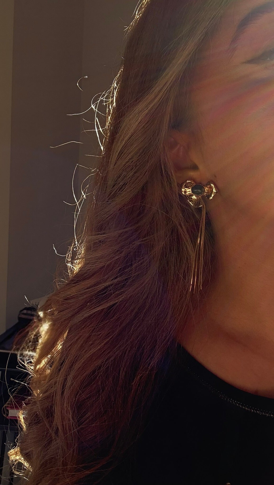 Boucles d'oreilles pendantes en acier inoxydable composées d'une fleur texturée ornée d'une pierre naturelle ovale et de mailles serpent pendantes.